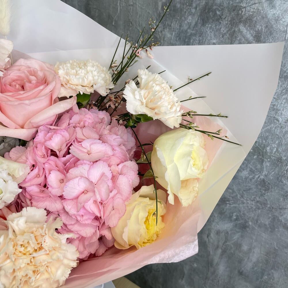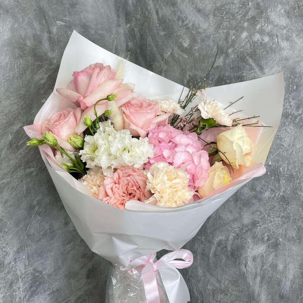 Pink O’Hara роза – 4 шт.white o’hara – 2 шт.Гвоздика – 3 шт.Гортензия – 1 шт.Лизиантус – 2 шт.Лагурус – 5 шт.Гениста – 3 шт.Упаковка дизайнерская – 1 шт.Лента атласная – 2 шт.