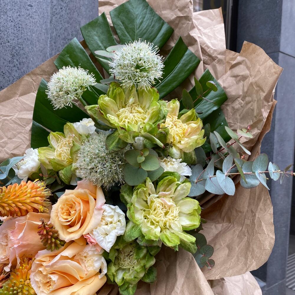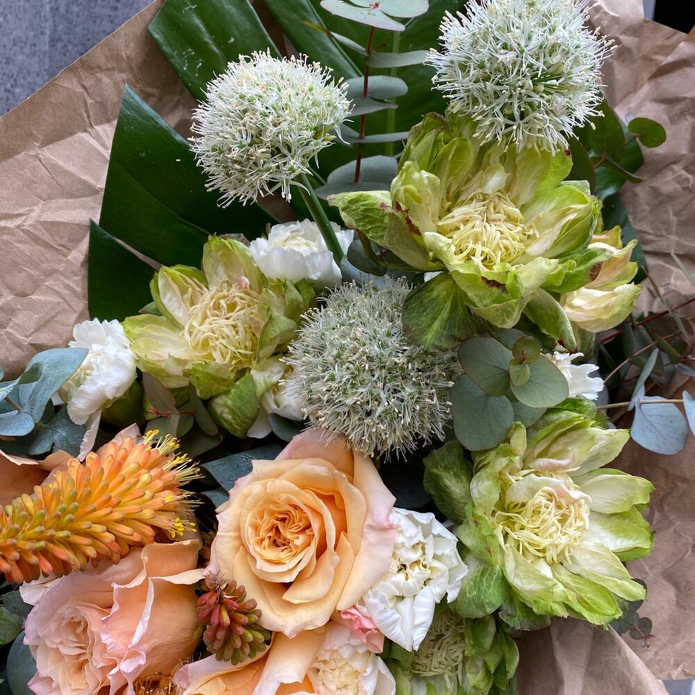 Диантус сортовой – 9 шт.Монстера 40 см – 1 шт.Аллиум – 5 шт.Орнитогалум – 3 шт.роза шиммер эквадор – 3 шт.роза veggie – 5 шт.Эвкалипт – 9 шт.Крафт упаковка – 4 шт.Лента атласная – 2 шт.