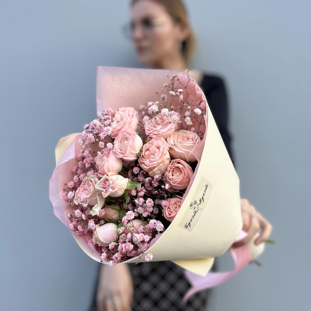 Букет «Ванильное мороженое» (кустовая роза и гипсофила)
