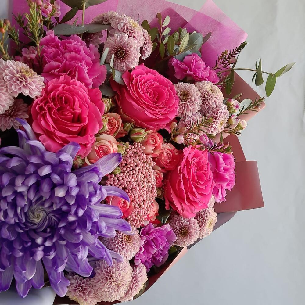 Роза – 3 шт.Хризантема – 1 шт.Сантини – 5 шт.Роза кустовая – 1 шт.Озотамнус – 1 шт.Ваксфлауэр – 2 шт.Диантус – 5 шт.Эвкалипт – 3 шт.Фисташка – 5 шт.Упаковка дизайнерская – 2 шт.Лента атласная – 1 шт.