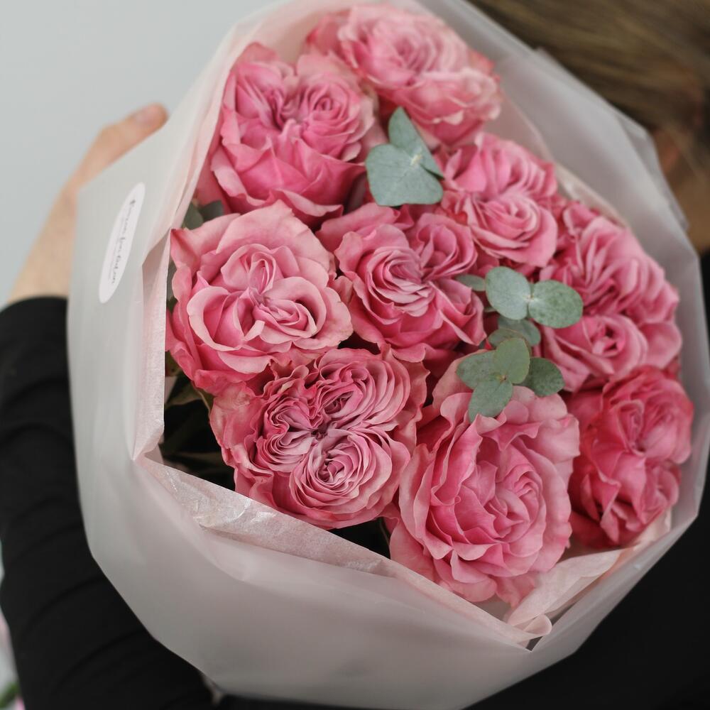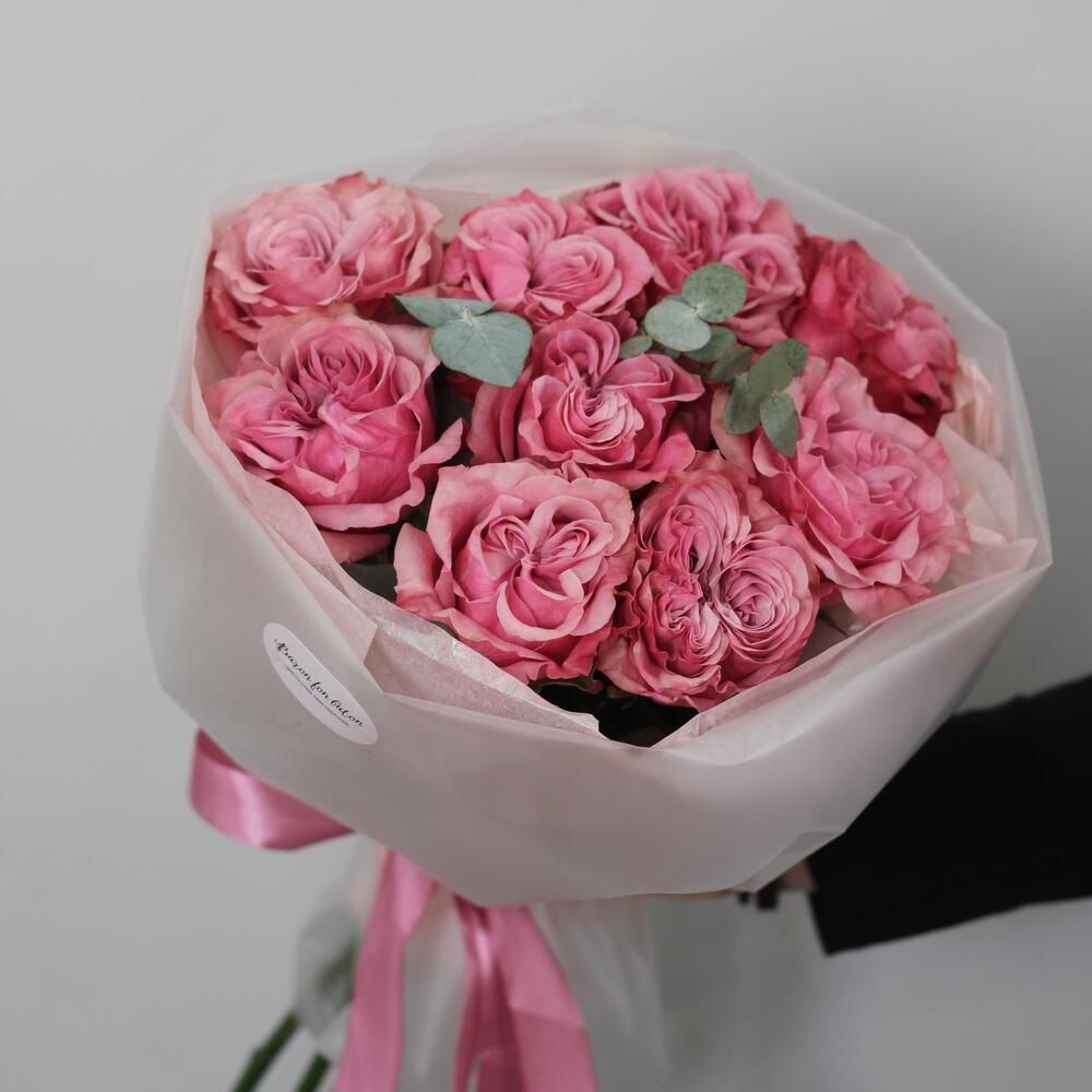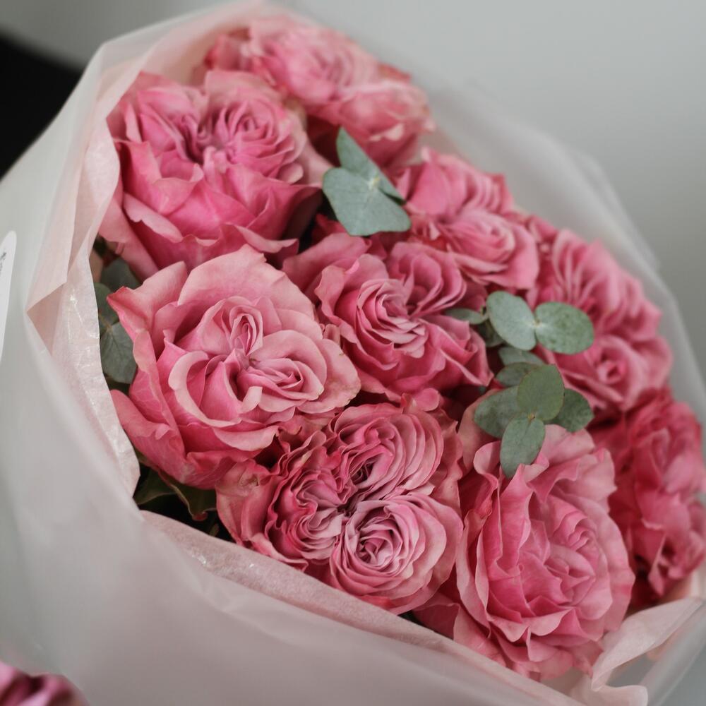 роза кантри блю – 9 шт.Эвкалипт – 2 шт.Тишью – 2 шт.Упаковка дизайнерская – 1 шт.Лента атласная – 1 шт.