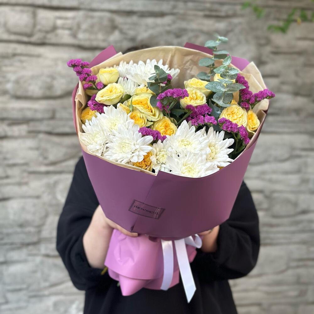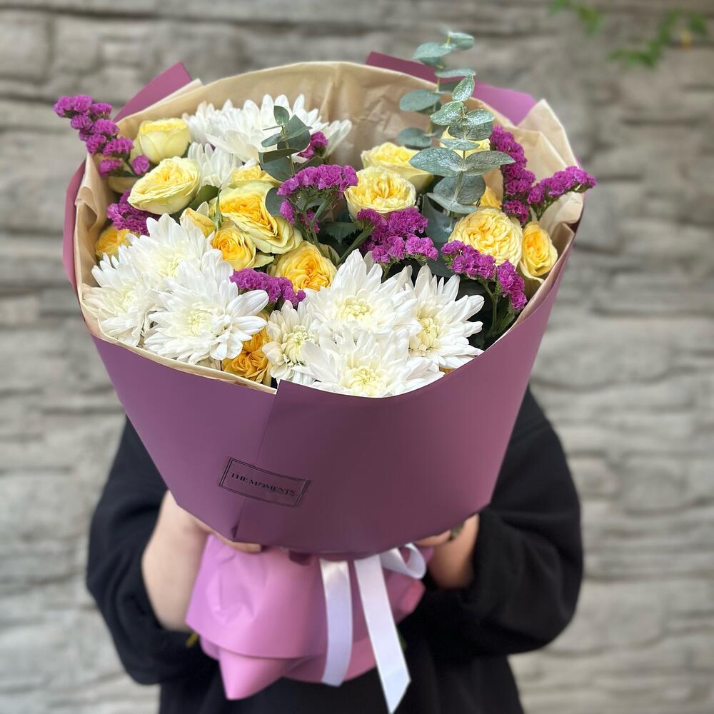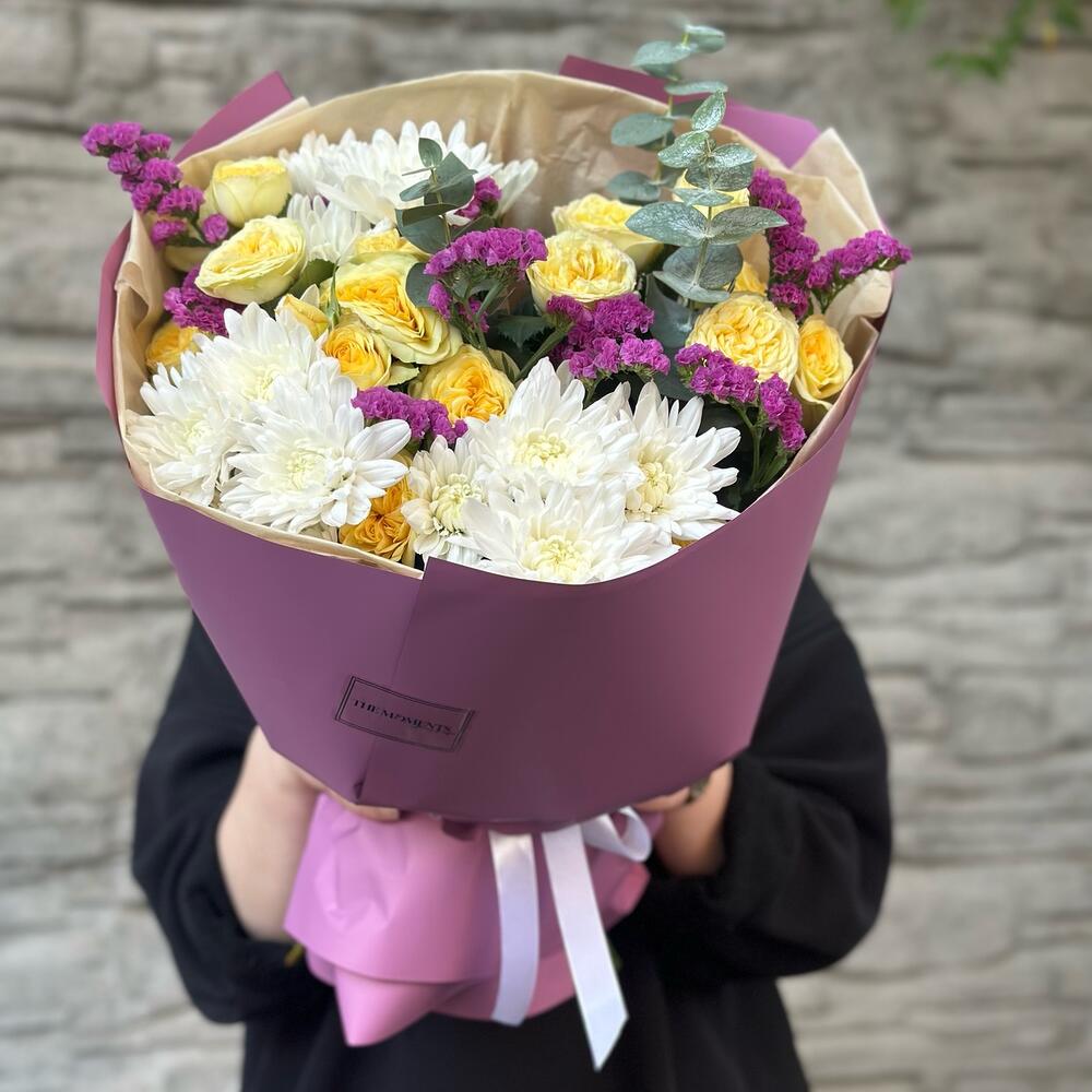 Альстромерии, Гвоздики, Кустовые розы, Лизиантусы, Розы, Хризантемы