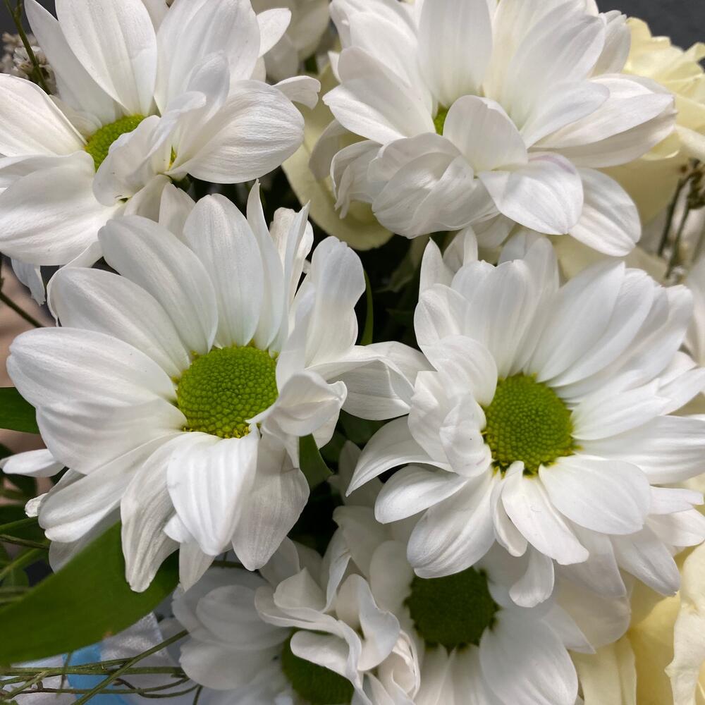 магнум белый – 1 шт.Роза – 3 шт.Лимониум – 2 шт.Ромашка кустовая – 3 шт.гиппеаструм – 1 шт.Зелень – 5 шт.Коробка шляпная – 1 шт.Оазис флористический – 1 шт.Лента атласная – 2 шт.