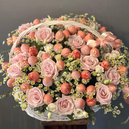 Корзина с клубникой, розовыми розами и ромашками