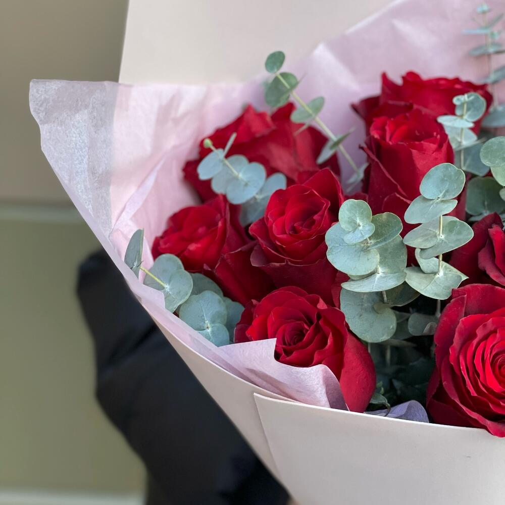 Красные розы с эвкалиптом в стильной упаковке