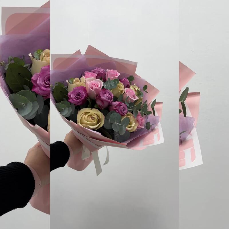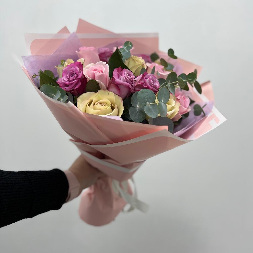 Упаковка дизайнерская – 1 шт.эвкалипт ветка – 1 шт.микс роз – 15 шт.