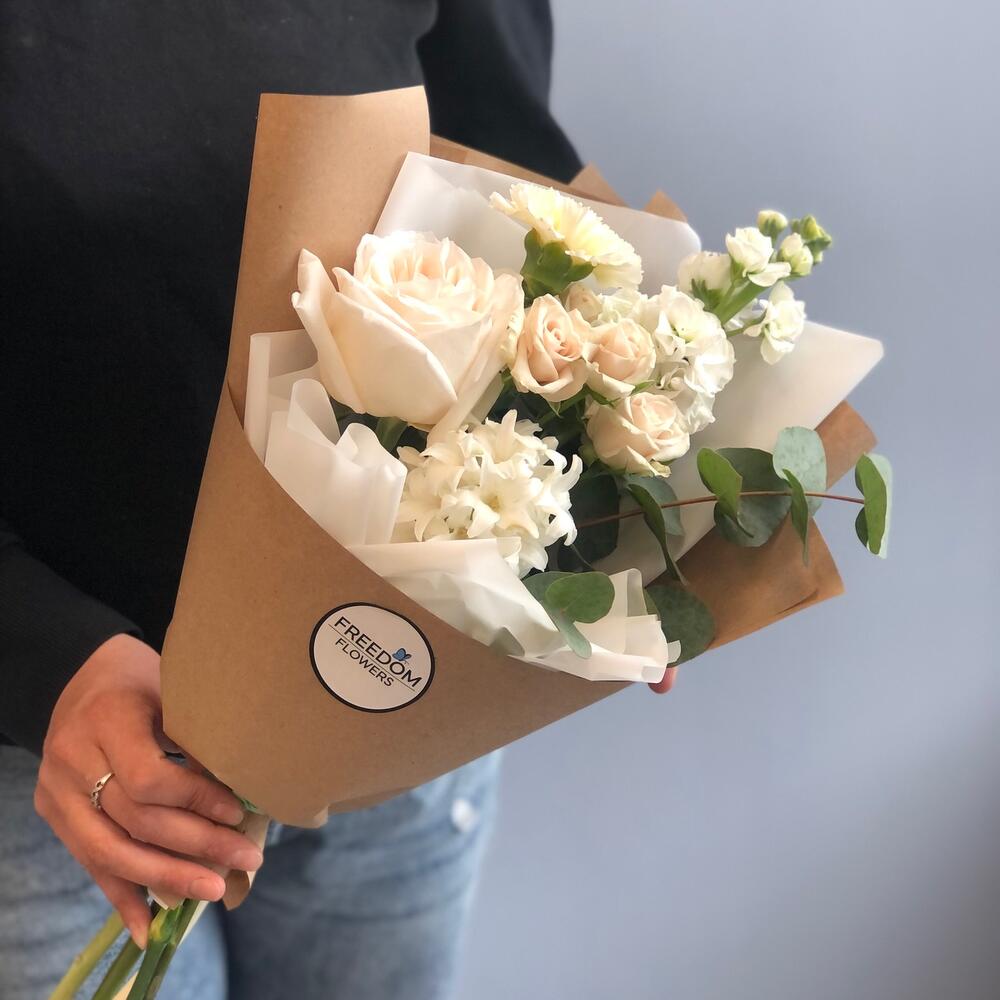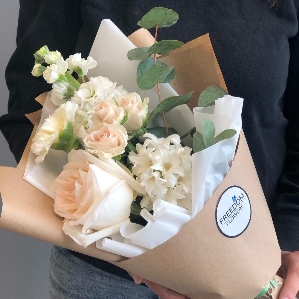Гиацинт – 1 шт.Эвкалипт – 1 шт.Гвоздика – 1 шт.Роза кустовая розовая – 1 шт.Роза пионовидная – 1 шт.Упаковка дизайнерская – 2 шт.