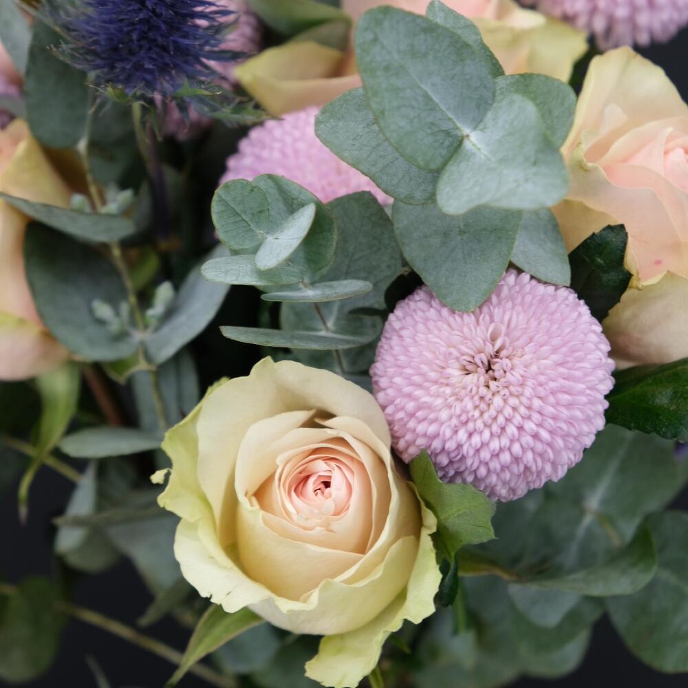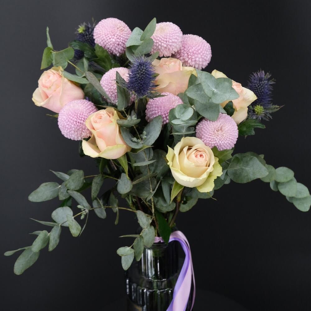 Хризантема момоко – 7 шт.Роза – 5 шт.Эвкалипт – 3 шт.Бумага – 1 шт.Лента – 1 шт.