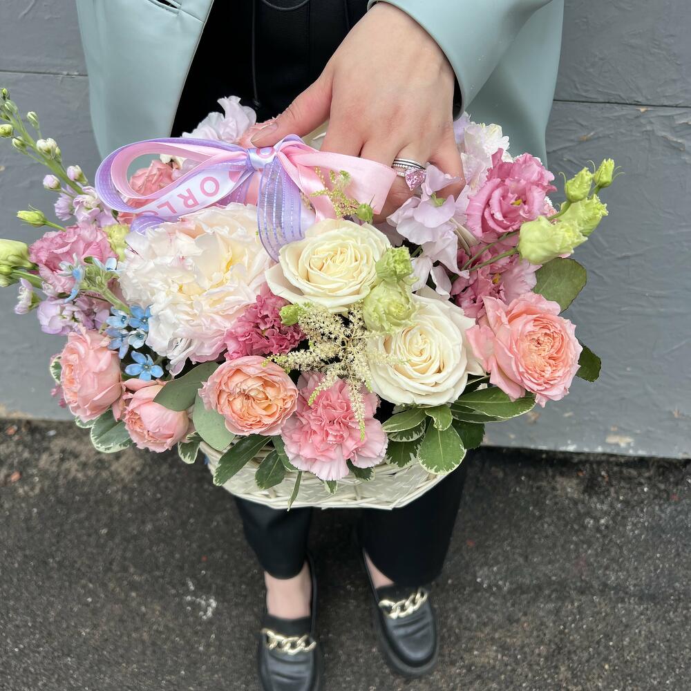 Корзина – 1 шт.Оазис – 1 шт.Пионовидная роза – 1 шт.Лизиантус – 2 шт.пионовидные кустовые розы – 3 шт.Маттиола – 2 шт.Роза Россия – 3 шт.Оксипеталум – 1 шт.Астильба – 1 шт.Зелень – 2 шт.Гвоздика – 5 шт.
