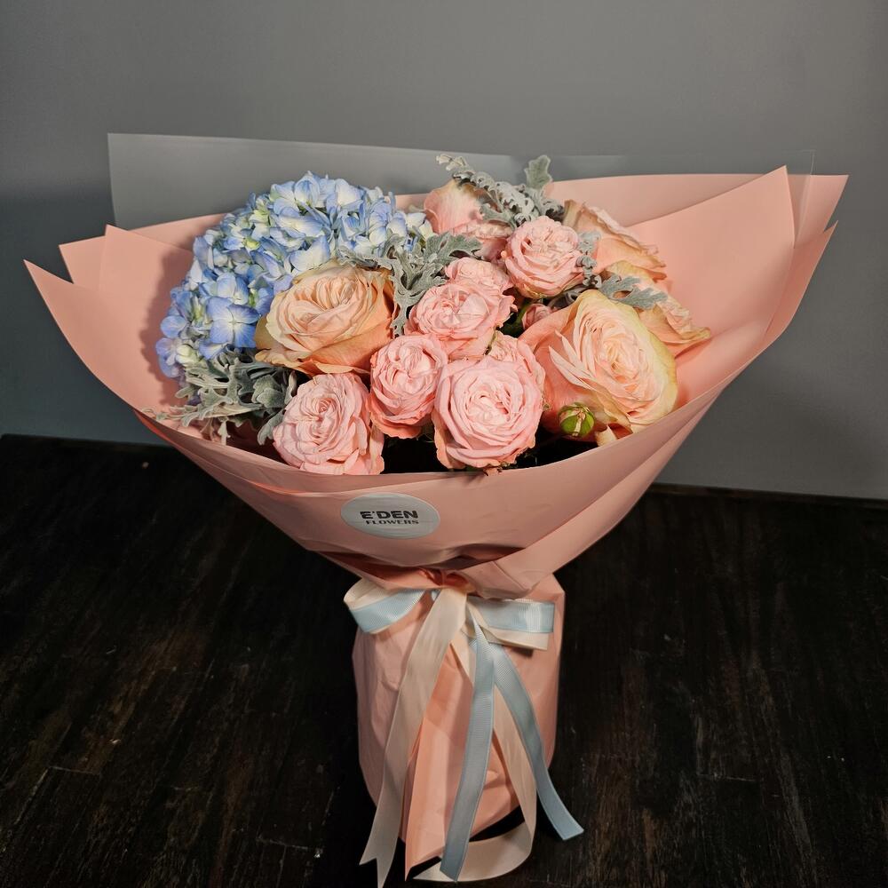 Альстромерии, Гвоздики, Кустовые розы, Лизиантусы, Розы, Хризантемы