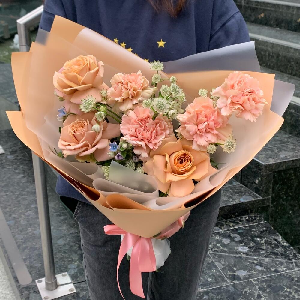 Роза Капучино – 3 шт.Диантус карамельный – 4 шт.Озотамнус – 2 шт.Оксипеталум – 2 шт.Упаковка дизайнерская – 1 шт.