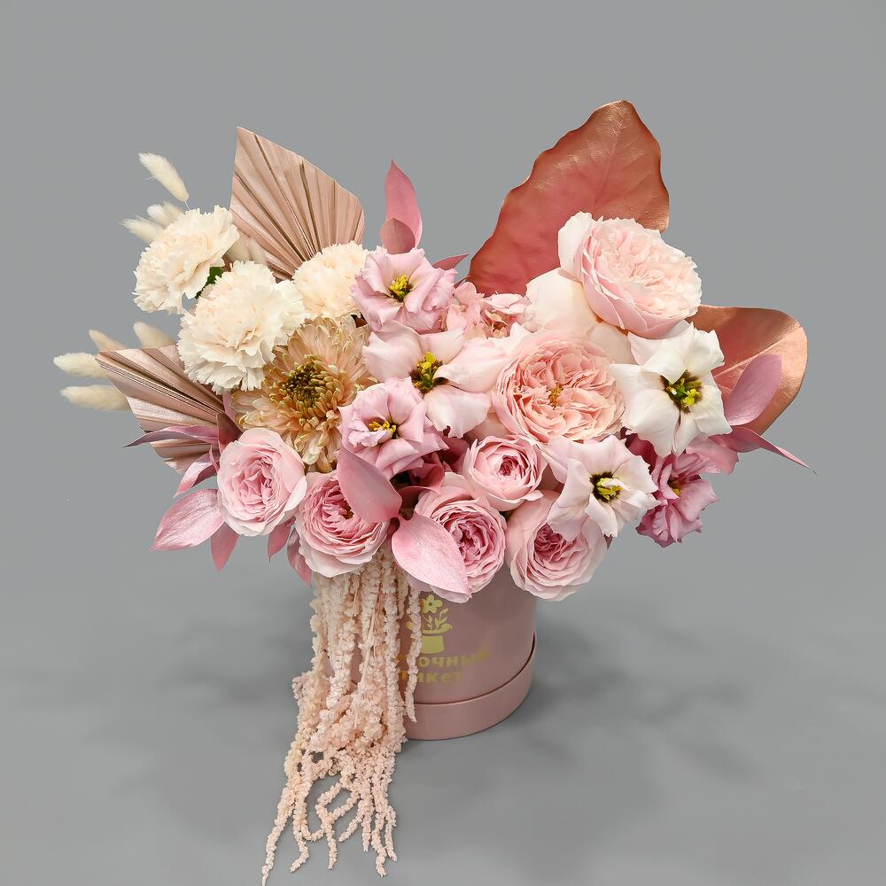 Нежная композиция в розовой цветовой гамме.В составе французские пионовидные розы, листья магнолии, кустовая пионовидная роза, похожая на пион, лизиантус, одноголовая хризантема и сортовая гвоздика.Флористы студии Цветочный Этикет собрали её из самых свежих цветов, тщательно … Показать ещёпродумав состав. Композиция готова удивлять красотой своего получателя! С композицией вы получите конверт с открыткой, в которой мы напишем любое пожелание, инструкцию свежести и средство для продления жизни срезанных цветов.