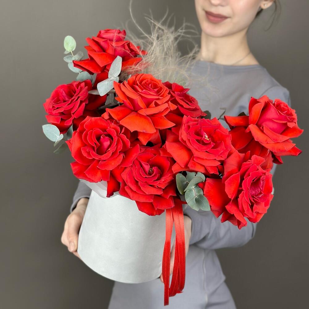 Шляпная коробка – 1 шт.Роза французская – 13 шт.Эвкалипт пучок – 1 шт.Оазис флористический – 1 шт.Дизайнерская упаковка – 1 шт.стифа пучок – 1 шт.