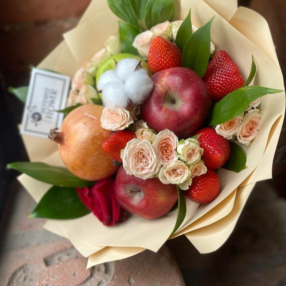 Клубника – 5 шт.Роза кустовая – 7 шт.Рускус – 5 шт.Хлопок – 1 шт.Гранат – 1 шт.Яблоко – 3 шт.Роза одноголовая эквадор 50 см – 1 шт.