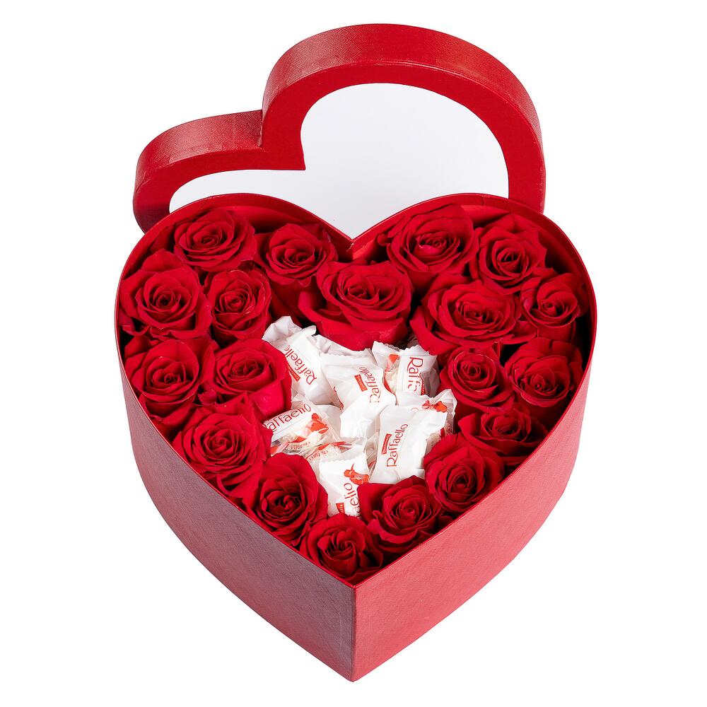 Сердце из 25 красных роз с конфетами