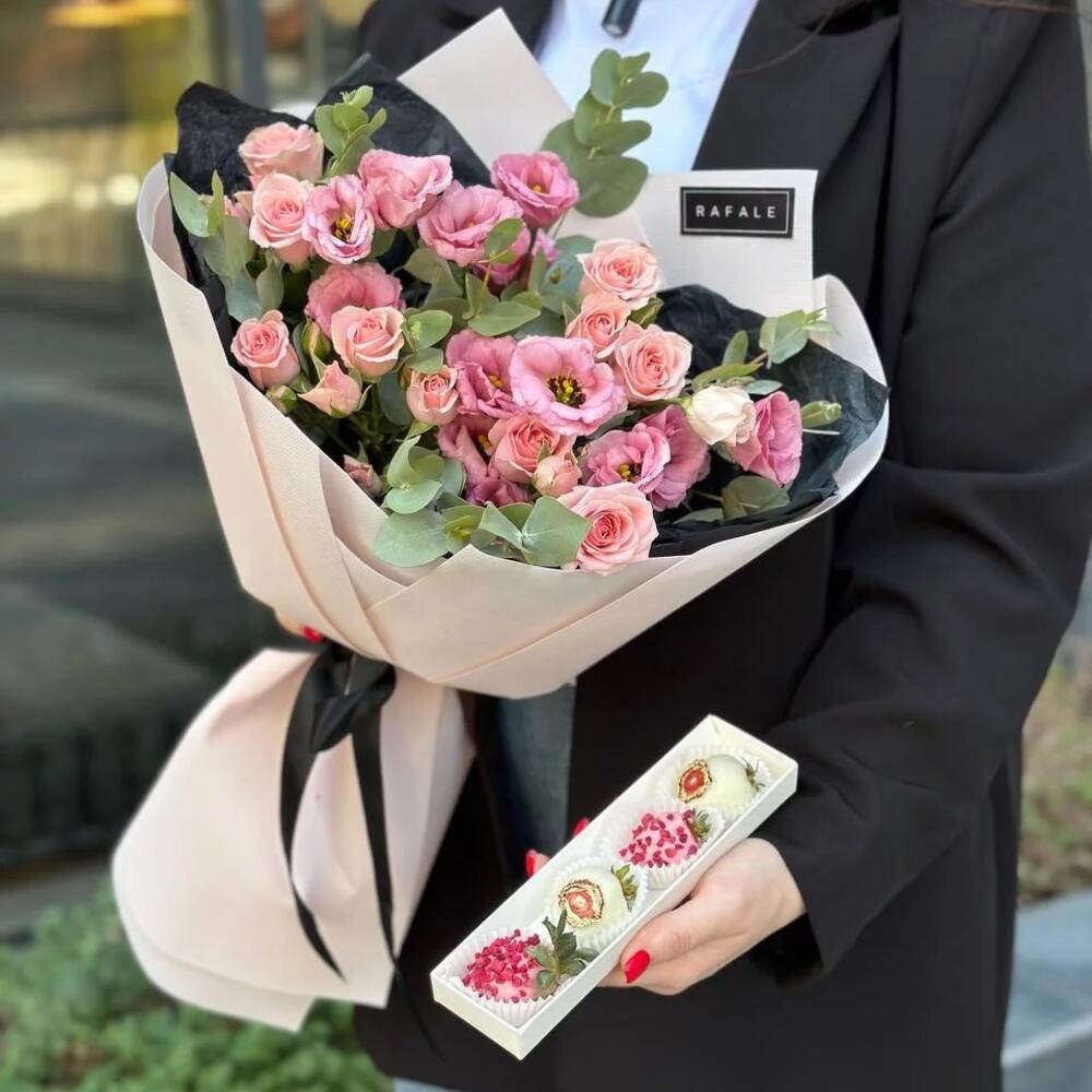 Сет из клубники в шоколаде и букета из роз, лизиантусов и эвкалипта.