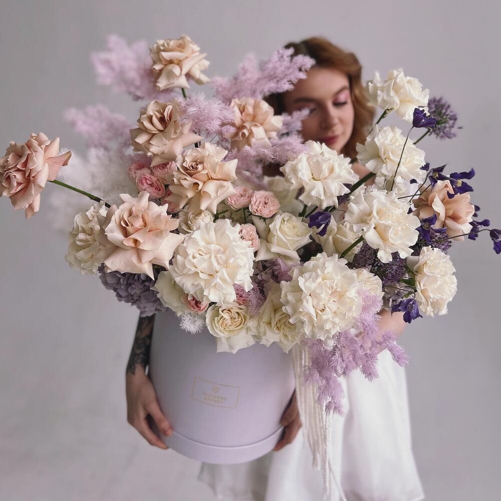 Шляпная коробкаБольшая пышная коробка с цветамиГортензииФранцузская Роза
