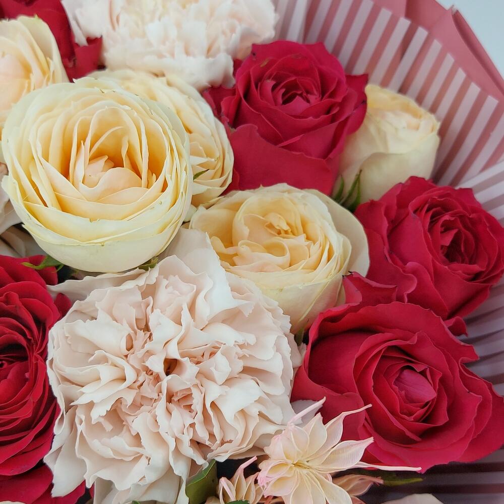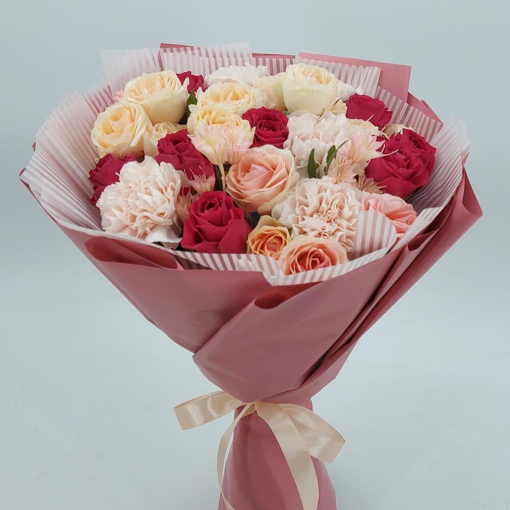 Стильный, фактурный букет из роз и диантусов. Такой букет всегда уместен и подойдёт для любого повода: День Рождения, именины, годовщина свадьбы, рождение ребенка, 8 марта, День Святого Валентина, выпускной и т.д. Можно вручить маме, сестре, подруге, коллеге, учителю, любимой.