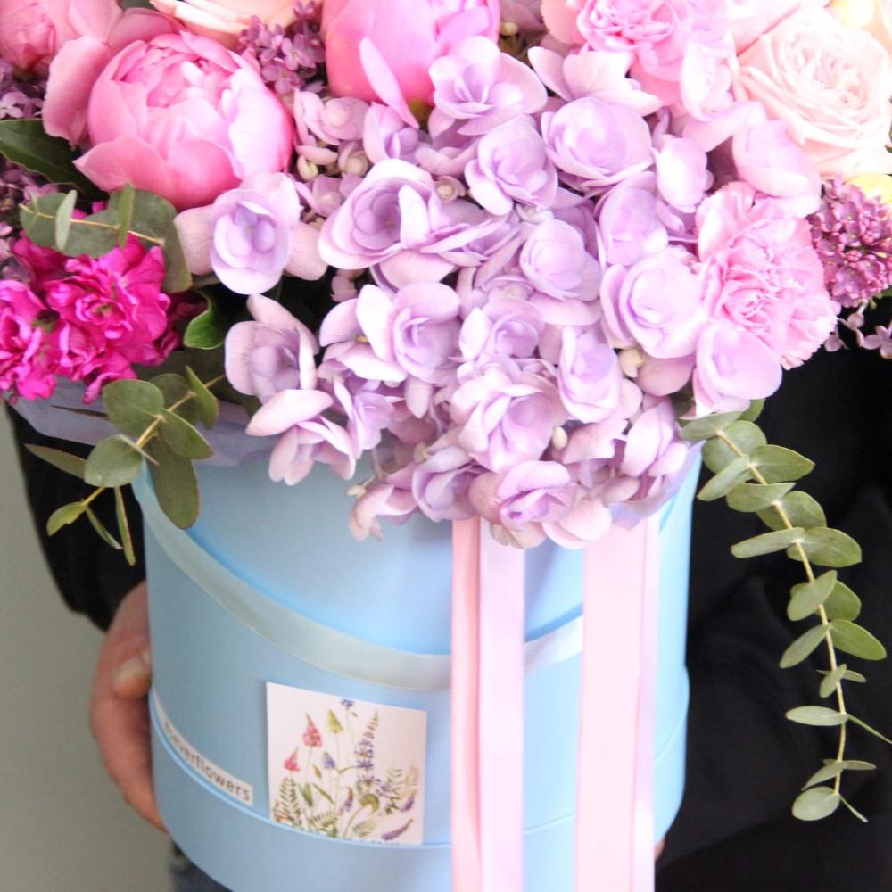 Гортензия – 3 шт.Пионовидная роза – 6 шт.Роза пионовидная – 5 шт.Маттиола – 4 шт.Гвоздика – 9 шт.Эвкалипт – 7 шт.Шляпная коробка – 1 шт.Лента атласная – 2 шт.Оазис флористический – 1 шт.
