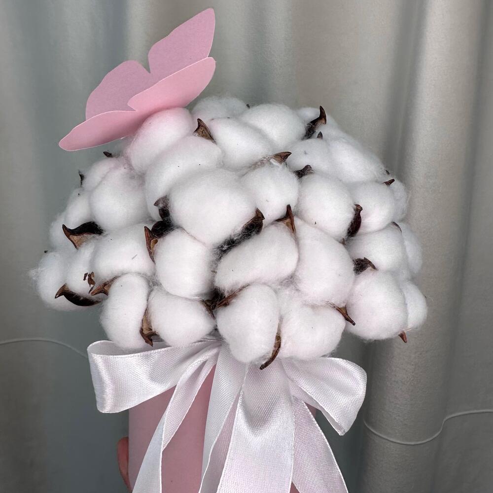 Хлопок натуральный – 15 шт.Шляпная коробка – 1 шт.Лента атласная – 1 шт.Открыточка с вашими пожеланиями – 1 шт.