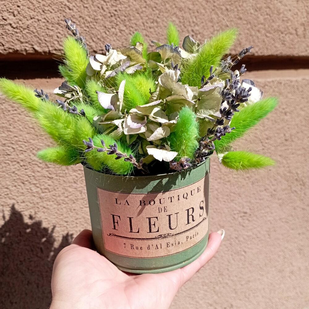 Лаванда (сухоцвет) пучок – 2 шт.Кашпо металлическое – 1 шт.Оазис флористический – 1 шт.лагурус пучок – 3 шт.гортензия стабилизированная – 1 шт.