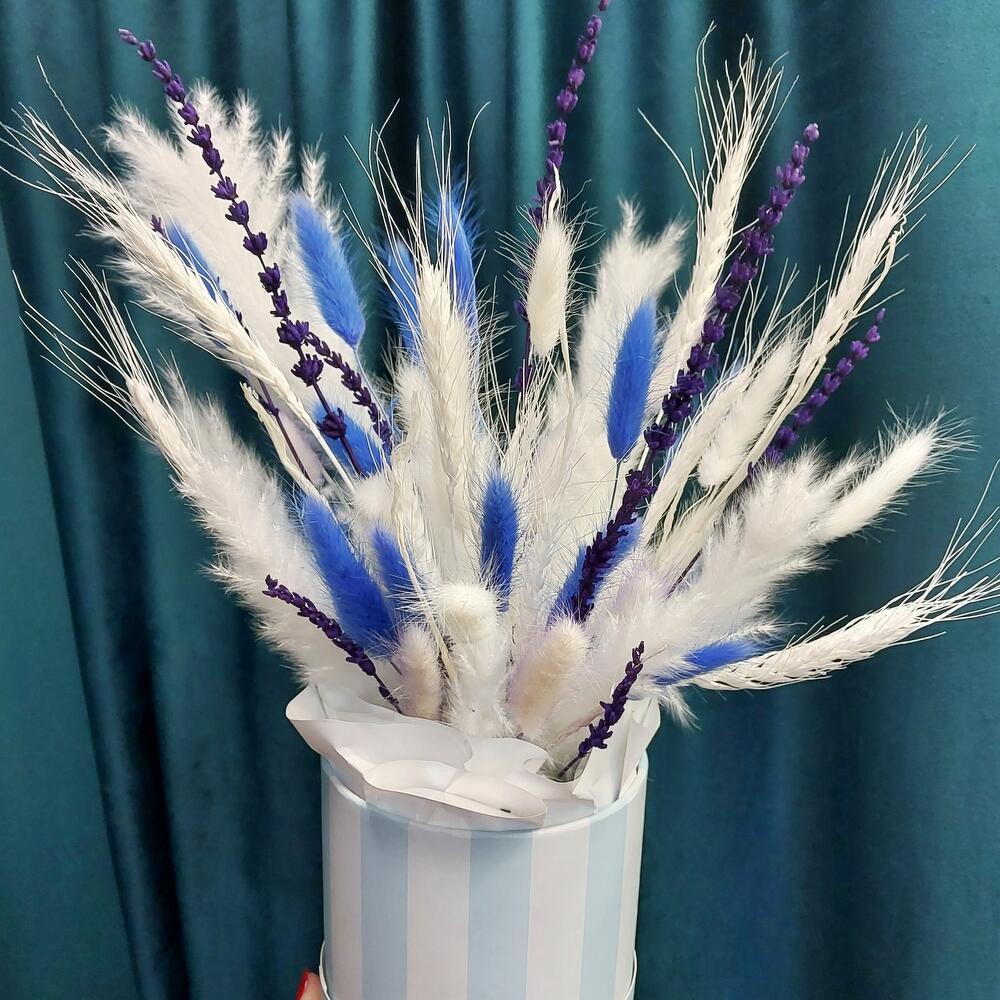 Лагурус (сухоцвет) – 7 шт.Лаванда (сухоцвет) – 2 шт.Помпасная трава – 5 шт.Пшеница (сухоцвет) – 3 шт.Оазис флористический – 1 шт.Коробка шляпная – 1 шт.