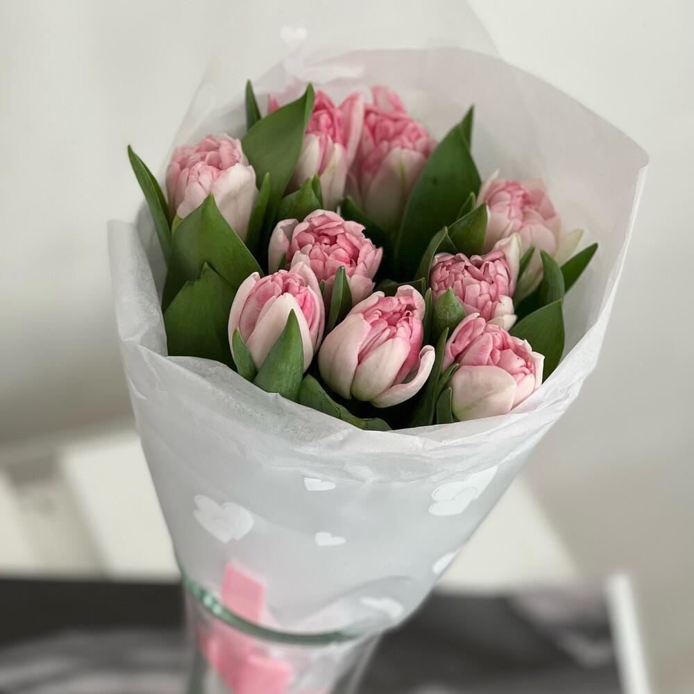 Упаковка – 2 шт.Лента атласная – 1 шт.Открытка – 1 шт.Тюльпан пионовидный – 9 шт.